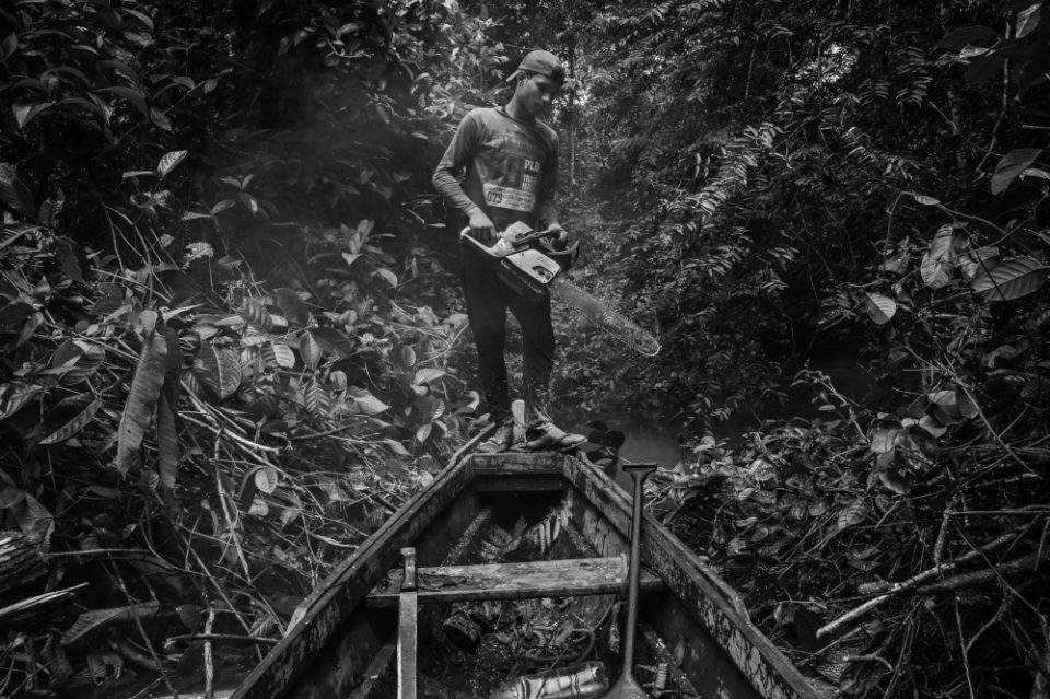 Jasson Oliveira do Nascimento, a resident of the Arapixi Extractive Reserve in the Amazonas state, cuts the vegetation with the help of a chainsaw to make way for the canoe in the stream that leads to the Antimary Extractive Settlement Project, where they collect Brazil nuts. This area is being invaded by land grabbers who are deforesting the jungle, threatening the way of life of this traditional population.