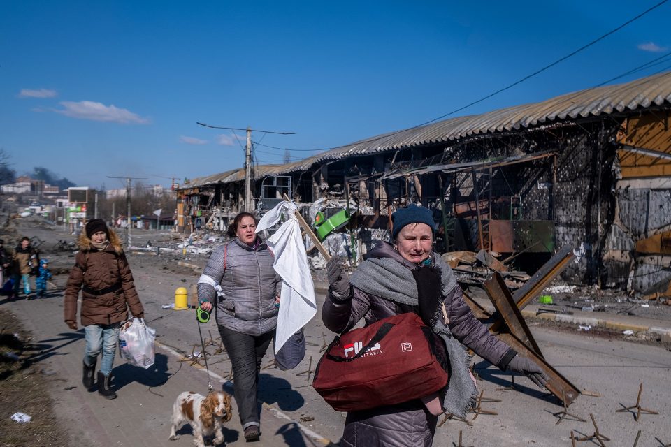 Ukrainians flee as the Russians advance into Irpin, Ukraine, March 10, 2022.