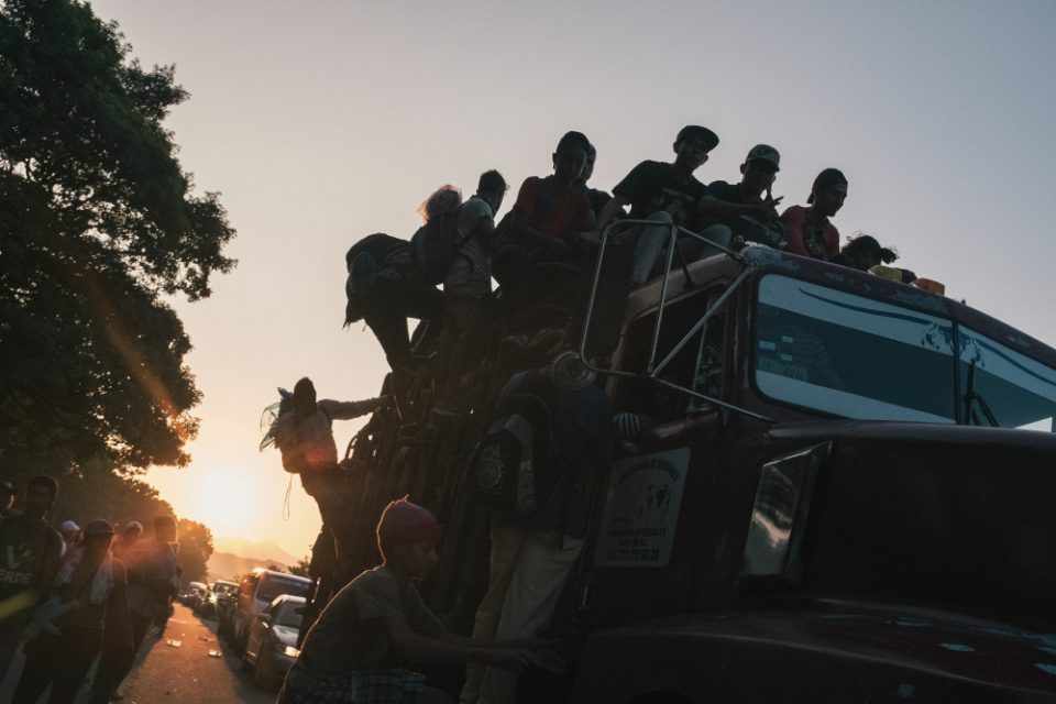 A group of Central American migrants ride a bus in the outskirts of Pijijiapan, Chiapas, Mexico, on October 26, 2018.