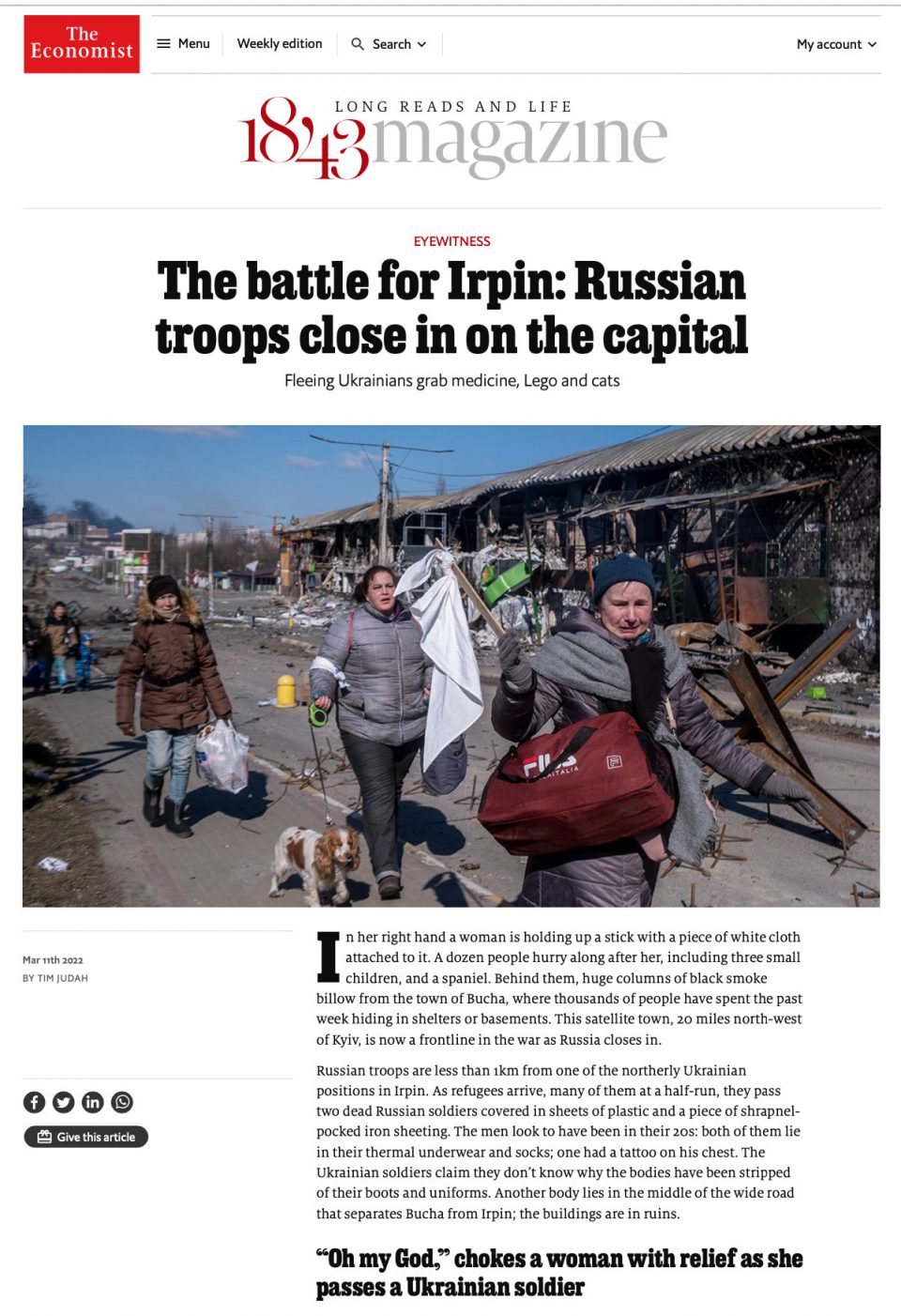 Photos by Ron Haviv / VII of Ukrainians fleeing the embattled town of Irpin during the Russian invasion of Ukraine, in The Economist 1843 Magazine, March 11, 2022.